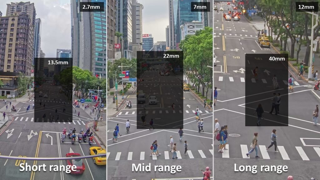 The shadowed areas within the photos visually approximate the coverage for each range, giving a clear representation of the surveillance capabilities across different focal lengths.